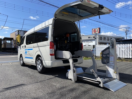 ハイエースではストレッチャー移動やリクライニング車イス(電動車イス対応)、標準タイプ車椅子(同時2台乗車可)など様々なニーズに対応します。(同乗者最大4名対応)