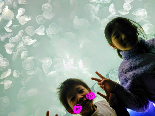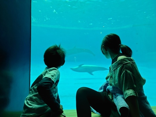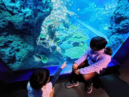 珊瑚礁の水槽では、娘の居るとこ居るとこついてくるお魚がいてみんなで大笑いヾ(≧▽≦)ノ