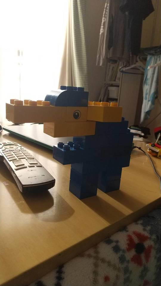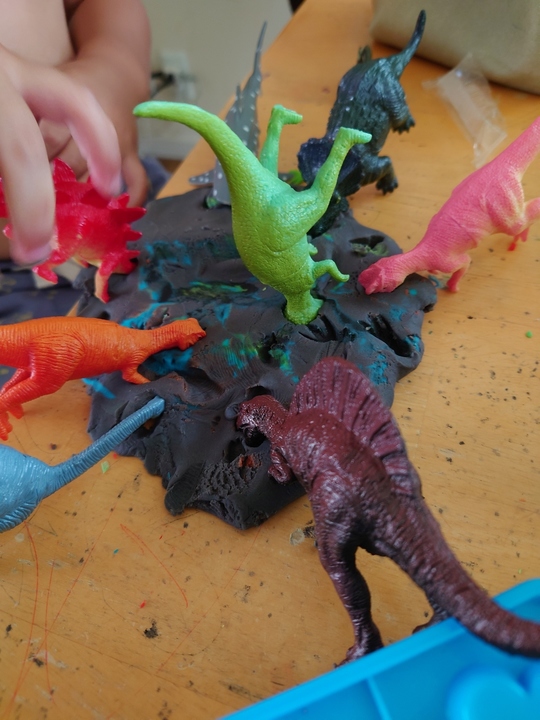 何を作るのか見ていたらおもちゃの恐竜たちの顔を埋め込み始める…あら完成!