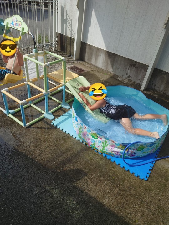 うちのプールが進化しました!最初はおもちゃをプールに入れるだけでも喜んでくれた子供たち!だんだんと飽きが来てしまい…ホースをもってかけまくる…( ゚Д゚)